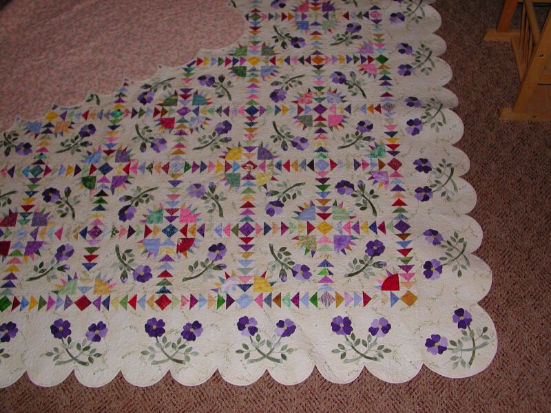 Paegan Les Fleurs - Even though I don't generally do traditional or what I call Fru Fru quilts, I saw this quilt in QNM magazine and it just spoke to me. The quilt published in the magazine did not have the scalloped borders. The ladies at the About.com quilting forum told me it had to have scalloped borders and I took their very correct advice.