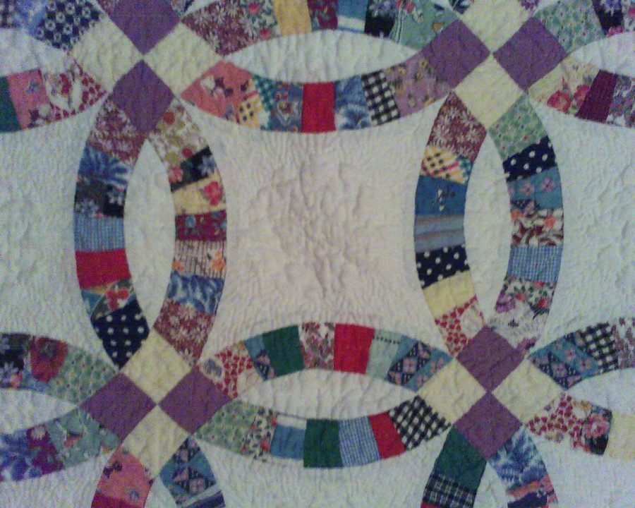 quilterdenise Double Wedding Ring - Antique pieces purchased at a car swap meet in the 1980's. Not complete. These pieces were very inconsistent in size and even shape. Not enough lavender fabric to complete. (it was originally set with lavendar background) After taking it halfway apart, I redrafted the melon shapes, used reproduction pieces to add the end pieces and then used the original lavender as one of the post colors and added the complimentary yellow posts. entirely hand pieced and quilted.