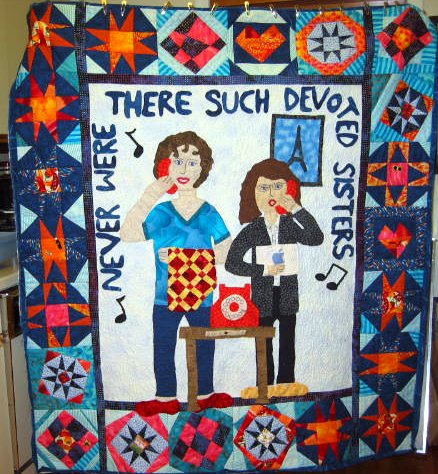 hbertsche Sisters - This quilt is done in the story quilt style of Mary Lou Weidman and was started in a workshop wih her at Quilting by the Lake in 2001. It was made for my sister Gail.