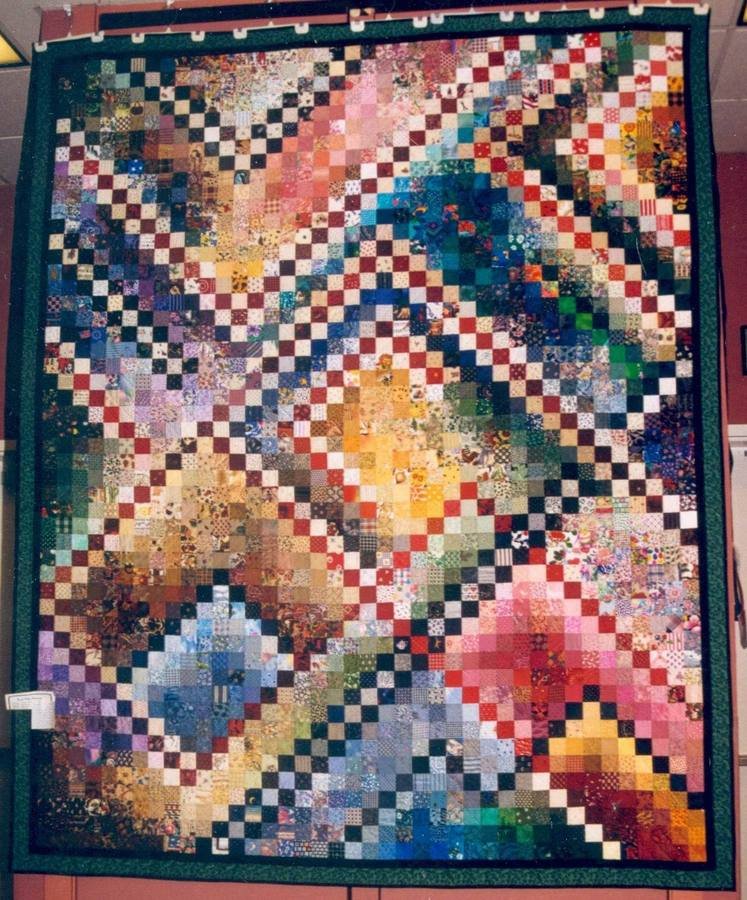 JudyPete Y2K Quilt - In 1999 I began swapping squares of fabric along with siggies (signature squares) with other quilters I met on the internet. We exchanged packets (squishies) of 25 different fabrics in 2.5 inch square along with a signatur square. The design is my original creation. The signature squares are stitched onto the back of the quilt. This quilt was in a special Y2K quilt exhibit in Houston in 2000?. It's huge (86"x106") and needs a LARGE wall for display.