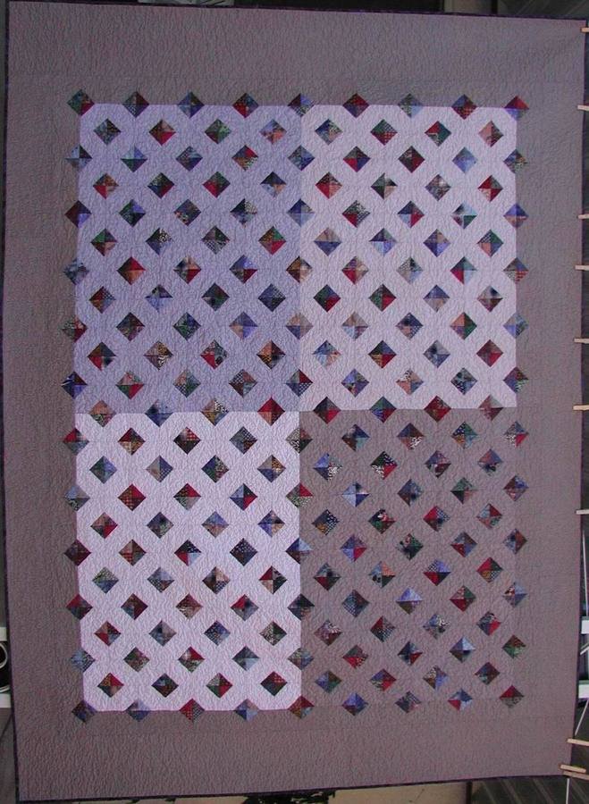 JudyPete Manly Quilt - This is one of the first of my "shirt" quilts. The background of each quarter of the quilt is from a single men's 100% cotton dress shirt (not to be confused with a shirt from a single, non-married man LOL). The "jewels" are purchased cottons from a quilt store. I call this "Manly Quilt" because of the shirt fabrics as well as it's simple, rather masculine design. I made the mistake of giving it to my grandson who was then 9 years old. He won't give it back to me and I want it back!!!!! Aaaaack!!