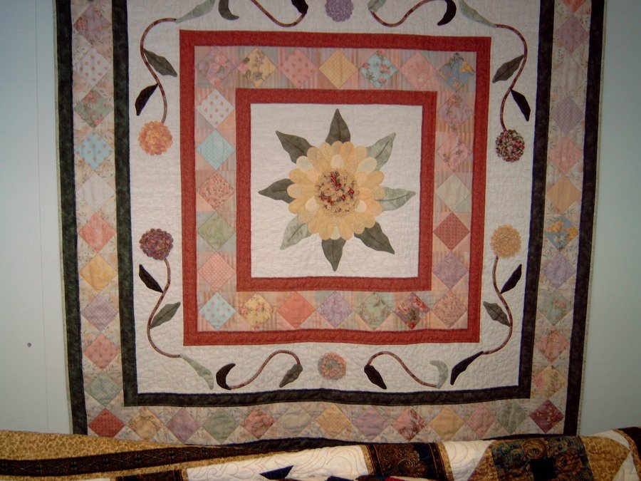 shirleyquilts Moda Sunflowers - Used many different Moda fabrics. Oversized blossom center surrounded by pieced blocks and trailing appliques.