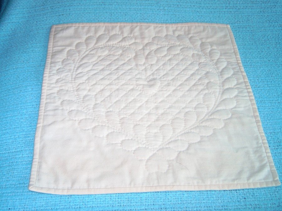 | Design Source - Description | This is my first hand-quilting project, a small 15" square feathered heart. Not bad for a first attempt, but it took soooooooo long. |