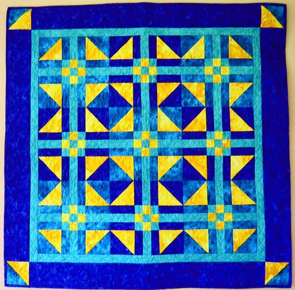 | Design Source - Description | My first attempt at machine quilting. Traditionally, the path & stiles pattern is made with two fabrics (light and dark). I added the medium turqoise and blue fabrics to calm down the quilt a bit. |