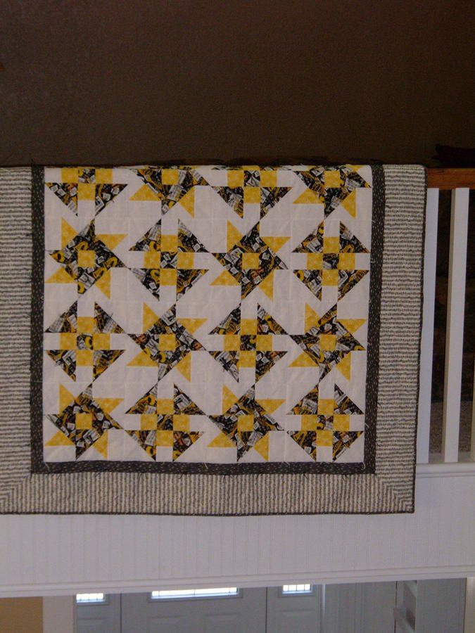 dchris174 Marlowe's Magic Music - Marlowe is our retiring church choir director. He is living with ALS and hopefully this quilt will keep his legs nice and warm! The blocks have musical instrument fabric (Marlowe is a saxophonist) and the border is music staff fabric. The borders are both mitered (which I DO NOT like to do) and the binding is bias to take advantage of the design on the black fabric.