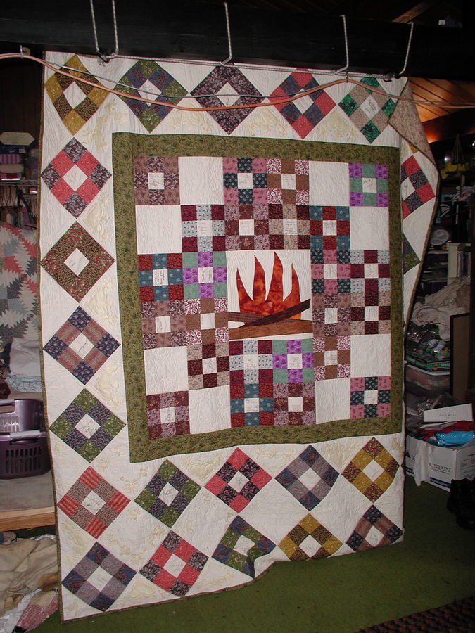 | Design Source - Description | This is a signature quilt commemorating a group camping event. It is done in mostly civil war reproductions with a batik campfire in the middle. The camping event took place in Cascade Locks, OR at the old Locks. |