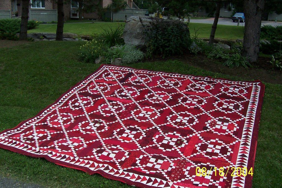 Stitcheswell Burgoyne Surrounded - This is my favorite quilt. It's a king size and resides on my bed most of the time. I can't find the pattern that was in Quilter's Newletter so I can't tell you what year it was published. It had a wonderful story about the history of this quilt block and the real battle that inspired the block back in 1772. I redrew the pattern into Electric Quilt and resized to to fit my bed. It was lots of fun collecting fat quarters in red and off white. Thanks to Margo who emailed me the the Quilter's Newletter edition my pattern was made from. You'll find on pg 24 for the November 1996 Issue #287.