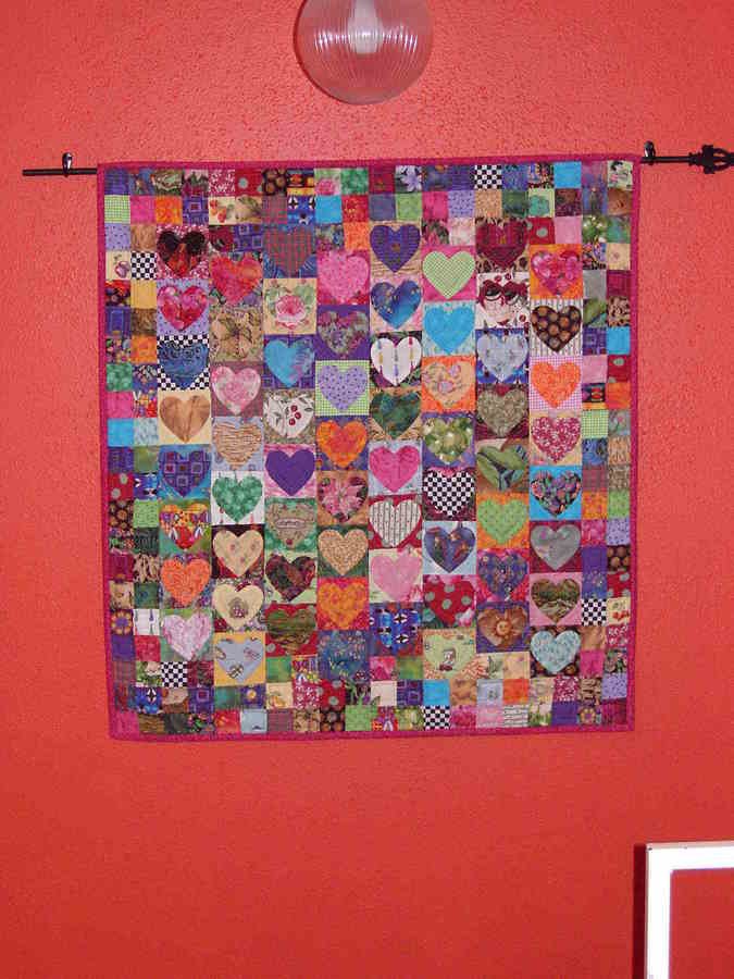 Houstonjudy no name-my first hand made quilt - these are hearts that are appliqued on pieces that are not exactly square. The inspiration is a quilt that often appeared on the set of Simply Quilts. I started it before I saw the pattern in Alex's book--can't remember name of the book. It actually has one small 'claw' hole because I have a bad cat. Otherwise it is mint condition because it has been --and will not be--any where but my wall.