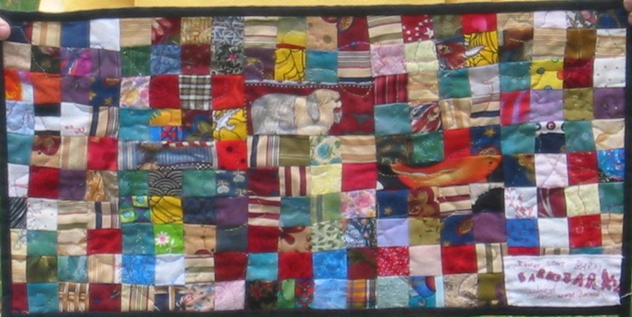 CuriousGeorge Sydney's quilt - This is my first quilt. I made it because I love my aunt's dog, Sydney. So I made it for her. I designed it myself, and made it myself. It is machine pieced and machine quilted. I put the binding and the label on by hand. Next I am going to make a quilt for my dog, Cider.