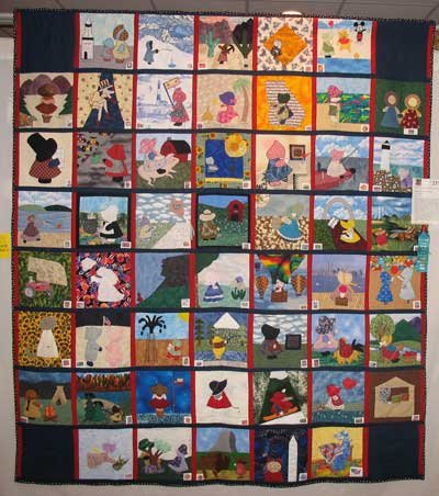 Sunbonnet-Sue Sunbonnet Sue in America - This quilt is the result of a nifty-fifty swap "Sunbonnet Sue in American". It was conceived in 2001 and finished in 2006. Quilters were recruited from all 50 states to make a block to represent their state. We each made 50 blocks, swapped them, and this quilt is the results. I travel and lecture on Sunbonnet Sue quilts and this one is always a show-stopper!