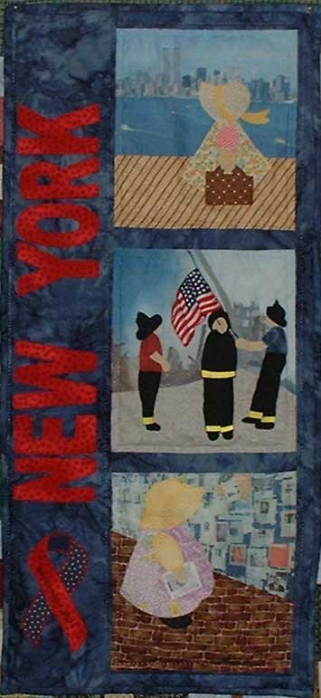 Sunbonnet-Sue Sunbonnet Sue in New York - This quilt was part of an exhibit at the 2001 Houston International Quilt Festival called America, From the Heart. It was auctioned for Charity along with 100 other quilts raising over $25,000 for the children of victims. A book of this exhibit was printed by C&T publishing. Called "America from the Heart", the book is now out of print. This small remembrance quilt of September 2001 depicts the way New York was at the beginning of September (top block), September 11th (middle block) and the days following when New Yorkers gathered around the “wall of prayers” (bottom). We will never forget.