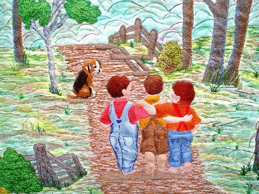| Design Source - Description | Landscape scene inspired by a photograph of my three brothers on the way to the creek to catch "crawdads" with our old dog Spot. |