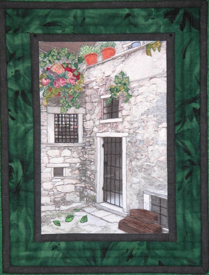 joanquiltedviews Colonnata Courtyard - Simple photo transfer that is embellished with fused fabric, raw-edge applique