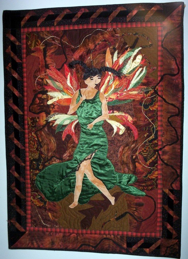 BrendaF Gino's Angel - This quilt is made with raw edge applique on top of a fabric collage background with a tule overlay. Inspired by a found photograph of a fairy, fabric was cut free-hand without a pattern. I was lucky to be able to take a class from Laura Fogg to learn this technique.