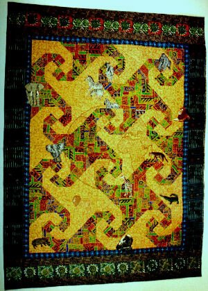 PattyC 3 Degrees South of Zero - All of the animals on this quilt were thread painted. The hemisphere in the middle was couched and thread painted. The quilt was machine pieced and quilted. The quilt was juried into ``Quilts at the Crossroads" in 1995 and into Williamsburg in 1996. I thoroughly enjoyed designing and making this quilt. But the zebras drove my eyes bonkers.