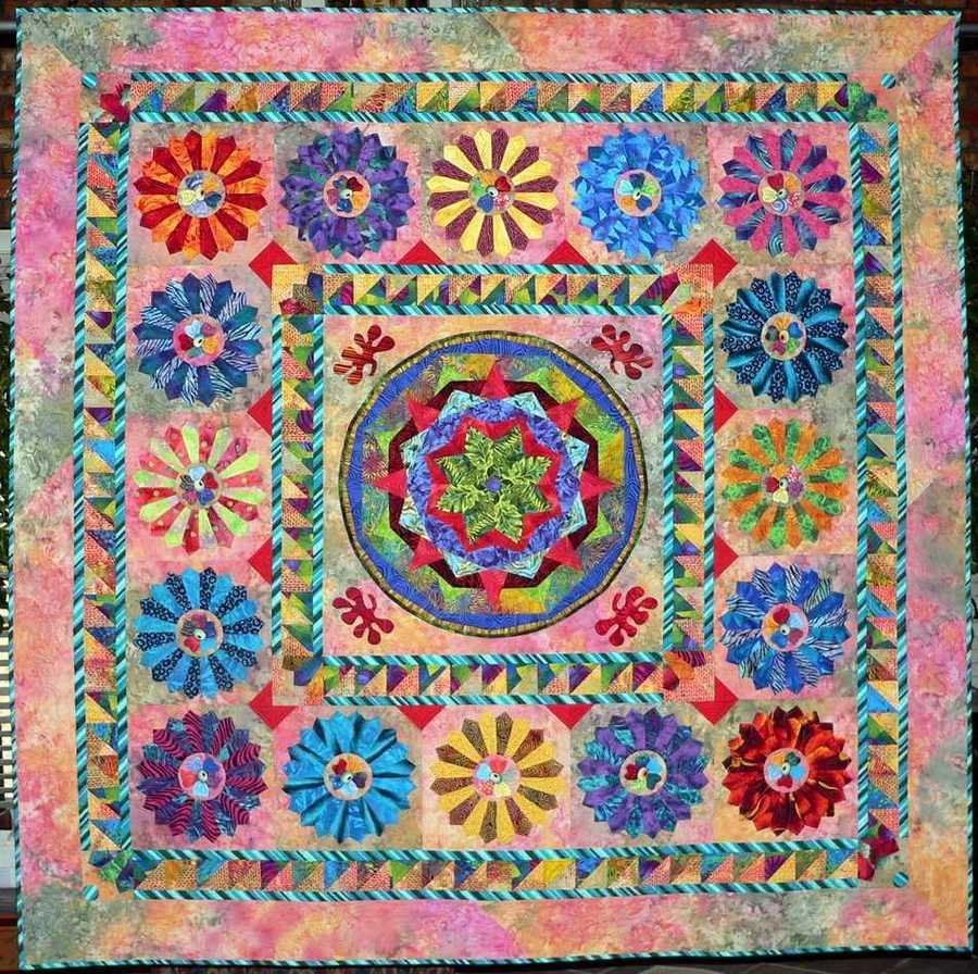 This quilt is my design using the traditional dresden plate and a kaliediscope center that I made some change on. Truly a fun project to be enjoyed my many. |