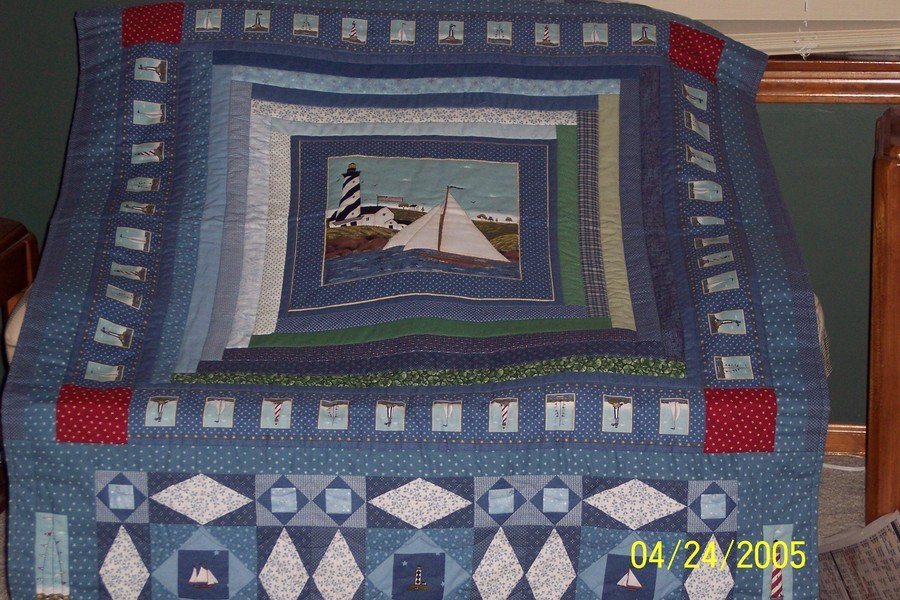 | Design Source - Description | My daughter gave me the fabric and I just created a frame around the sailboats using log cabin experience. Then I wanted to add the storm at sea and use some other images from the fabric. |