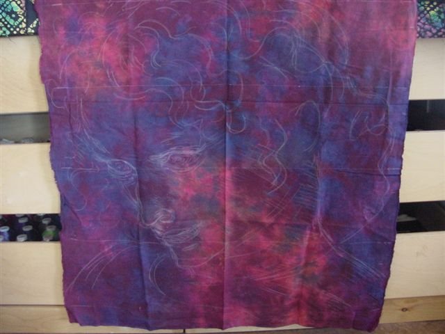 jimlangland maidenshead - Using removable white chalk I free-hand drew my interpretation of a da Vinci sketch. The classic line study of a maiden's head seemed to be a good choice for the deep-blue and purple hand-dyed fabric from the Ricky Tims fabric collection. This is the 2nd in a series of da Vinci interpretations that I am currently working on. At the time of this photo, the sketching was complete and ready for quilting. With this quilt, I am having the quilting done on an APQS Millennium by Marilyn Badger.