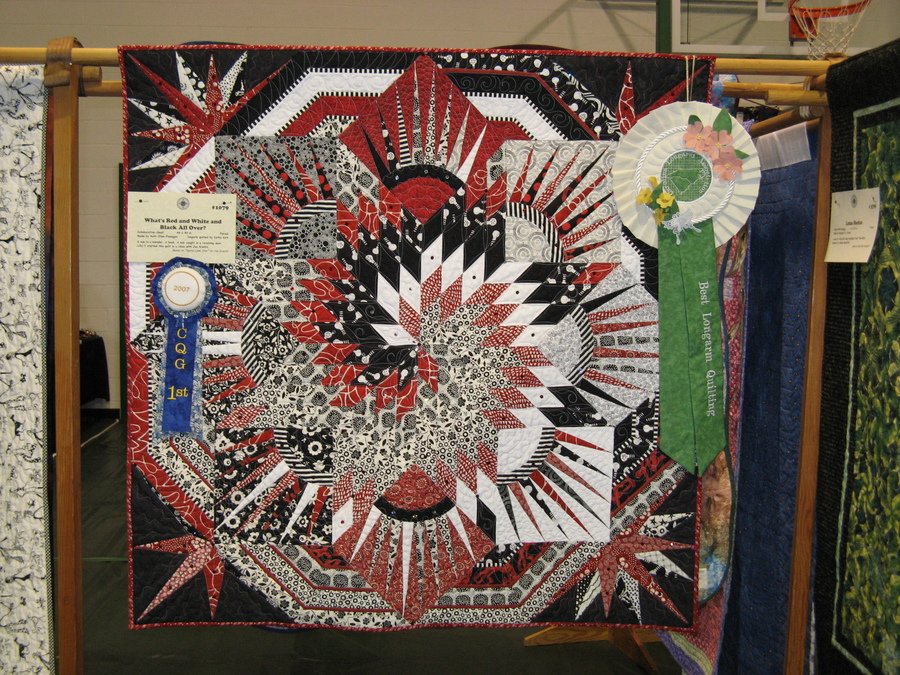 needlepointernc what Is Black & White & Red All Over? - I started this quilt in a class with Jan Krentz. It is from her Lone Star book. I wanted to do it in Red, White and Black. I am doing a lot of quilts now in those colors. Cathy did a great job quilting it for me. I add swarovski crystals to give it some bling. I won a blue ribbon and Cathy won Best Machine Quilting at the Raleigh Capital Quilter's Guild show this past May.