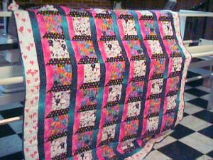 Bethindc Woof Woof - I used EQ6 to design this quilt and based it on one of their patterns. I also scanned the fabrics so I could see what it would look like with the fabrics I chose. I quilted it on my Viking Megaquilter and the quilting pattern just says "woof woof woof" all the way across the quilt. Gale is a dog lover.