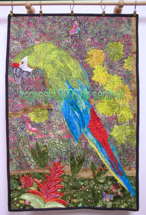 Krissi Oscar Bird - Raw edge applique and threadplay - my very first art quilt depicts a Military macaw, Oscar, who spent his first three years being physically and verbally abused. He now lives in a home who loves him very much with people he trusts.