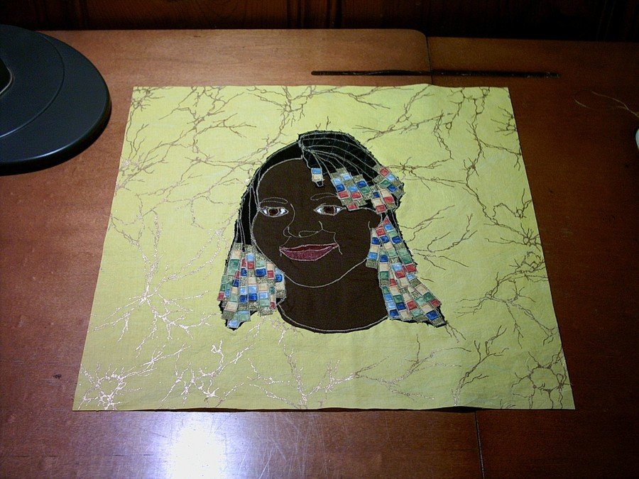 Boye3456 Maya - I was given a challenge fabric by my quilt guild with the instructions that I had to depict something worn. I used a photo to make this cloth portrait of my adopted daughter. The challenge fabric is found in the beading in her hair.