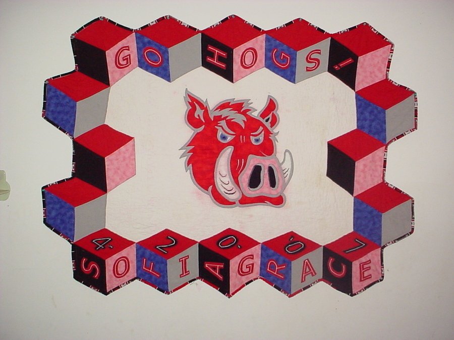 quilterguy27 Baby Hogs Fan - Tumbling block & Appliqued hog that I drew and made pattern for myself for Baby Hogs Fan quilt for my neices baby. Quilt Finally finished. Tumbling blocks around outer edge. Applique Arkansas Razorback in center. Pieced, appliqued, & domestic machine quilted by me, Doug J. Riggins.