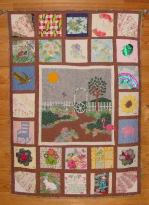 WandaQuilts Jane's Garden - This started out as a small group project for a friend and then grew into a full size quilt as word spread and many who love Jane wanted to submit a block. Blocks came from FL, ME, MO, AL, GA, TN and TX. The center block was designed (fusible appliqué) to depict an iron wagon wheel gate that Jane wanted for her garden and all the blocks represent the individual maker. The idea was that Jane would know who made each block by sight, and she did.