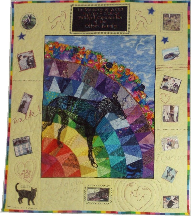 ocindyo Anna - Anna was a greyhound rescue who was our faithful companion for 2 1/2. She is shown on a paper-pieced rainbow ridge. Anna is shown as transparent thread painting. She is awaited by her playmates from the Laura Burch fabric line, waiting over the rainbow ridge for her to join them.