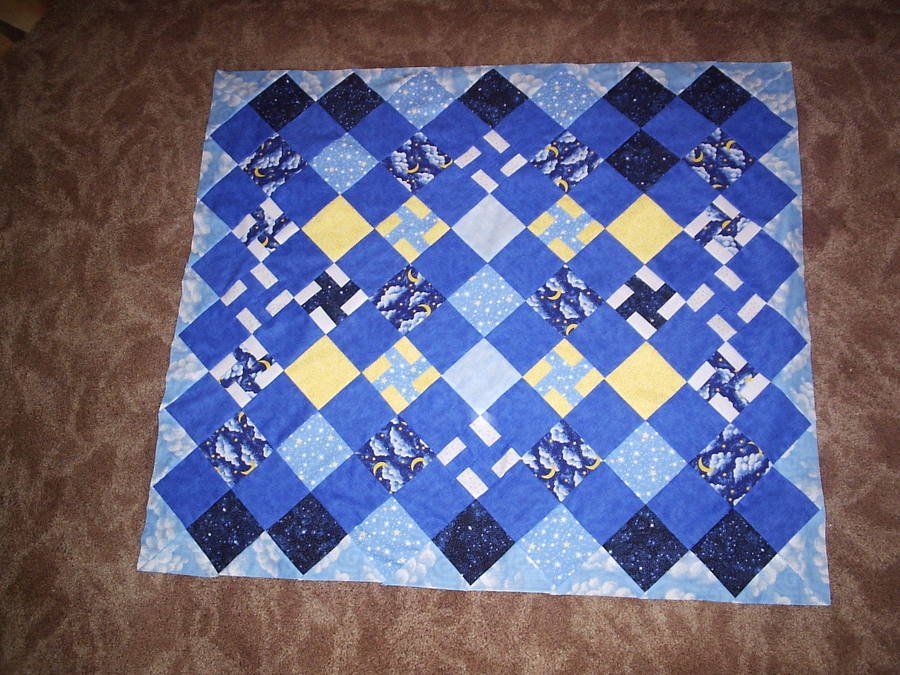 | Design Source - Description | This was made of all blue sky, moon, star fabrics and sunny yellows for the birth of my grandson, Max in November of 06. This was my very first quilt. |
