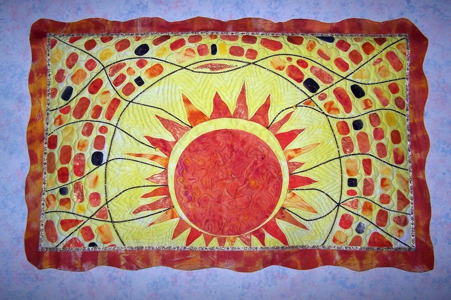 | Design Source - Description | I saw a picture in the newspaper of a backdrop with a large sun and thought it would be a great opportunity to practice setting in a circle and lots of raw edge applique. |