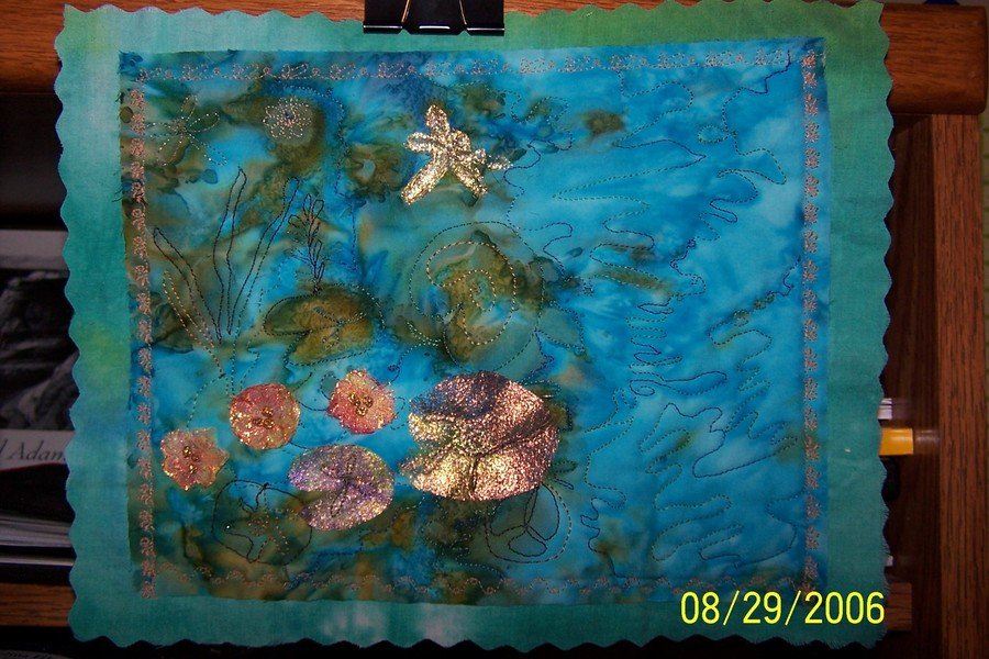 mray300 Down The Lazy River - Small whole cloth quilt; backing my hand dyed fabric. It's not totally rectangular and the edges are raw edge scallops.