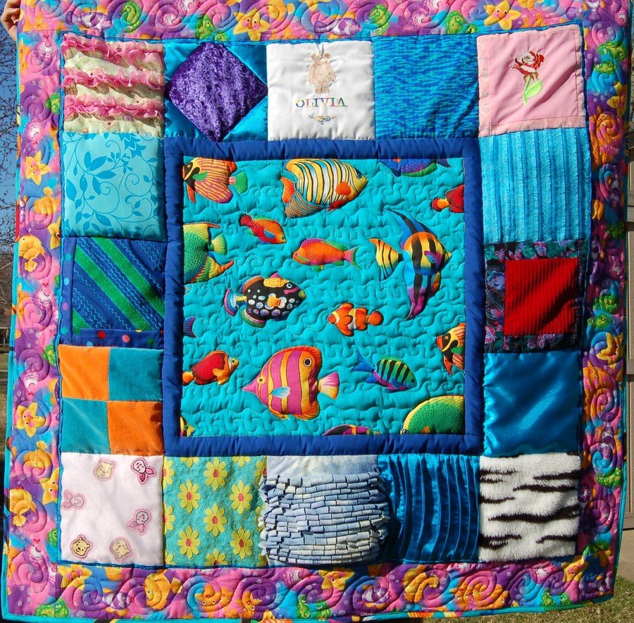 CindyTee Serendipity Seas - Assorted textures surround bright tropical fish. Entirely scraps and remnants. Made specifically for use on the floor, to lay the baby on when she has her baby exercise sessions.
