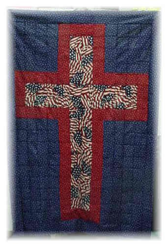 AuntiePam Flag Cross for IRAQ - Made for my military naval chaplain friend who was accompaning a Marine buttalion out of San Diego to 6 months in IRAQ during the war. He specifically requested a cross quilt to hang up when he did open air services. Was made from 4" squares of flag bring, then red with white stars as a single row all the way around and the background was the same print of the red but in navy blue. Chaplain Dan Hall made it home ok. The quilt is hand tied with crochet thread at each corner intersection.