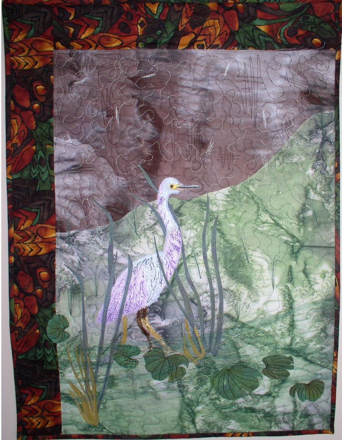 LindaD Visit from a Great Blue - This quilt features free motion embroidery free motion machine quilting. Many of the fabrics were hand dyed by LindaD. This beautiful gift from God is a frequent visitor to my back yard.