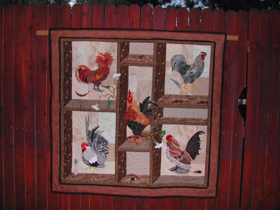 | Design Source - Description | Quilt 47"x 47", Made for my daughter who collects Roosters. My first machine quilting and machine applique. Applique techniques learned from Ricky Tims, Quilt Camp in the Pines! |