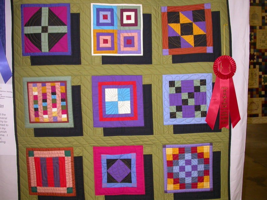 scoobadvr floating amish sampler - it is a 34.5 X 34.5 wall hanging. the blocks look like they are floating off of the quilt.
