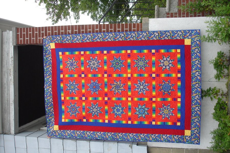 QuiltFan Arturo's Stars - I made this for my nephew's 7th birthday. He specifically requested a red quilt.. I had already bought the blue robot print fabric with the intention of doing a stack 'n whack quilt. I immediately ran to my batik stash and found the perfect orange-red hand dye which I used for the stars' background.