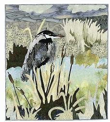 KDQuilts Great Blue Heron - This quilt was a finalist in the 2003 Pacific International Quilt Show, 2004 AQS International Quilt Show in Paducah an 2004 Seattle Quilt Show. Available for purchase at www.kdquilts.com for $1,200.00 plus shipping.