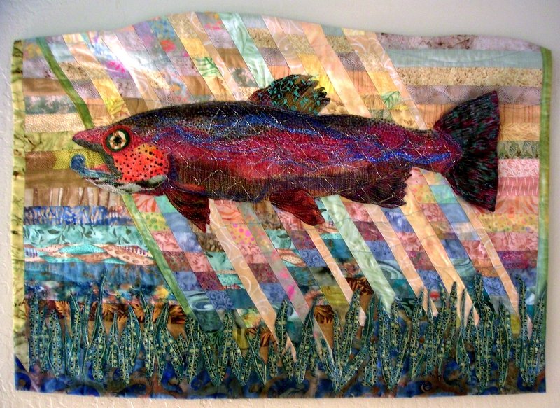 DianeAnsel Tusher Trout - Combination of collage fish on a background of multi-striped watercolour feeling strips. I TRIED to get the effect of sunlight shining through water.