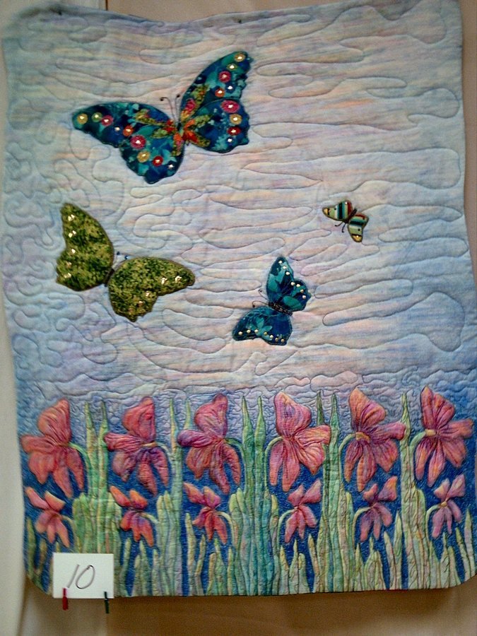 | Design Source - Description | crayon on muslin, applique butterflies with stones. thread painted, curved edges. |