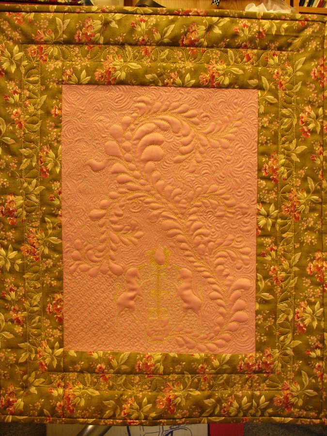 | Design Source - Description | I made this quilt as a donation to the NQA Little Quilt Auction. Wool bat and free motion quilted using YLI silk thread. |