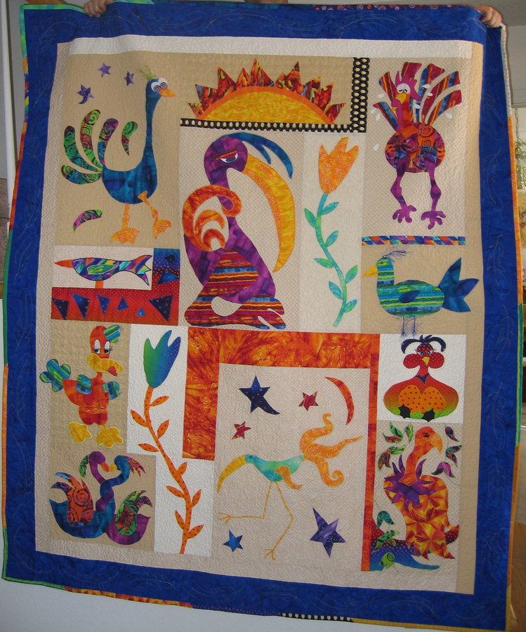| Design Source - Description | This was my first quilt larger than a small wall hanging. It was so much fun to put a personality on each bird. The quilter did an awesome job and put feathers all around the border. |