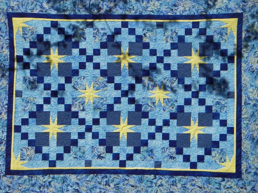 Pamelyn Evening Glow - My family, including Mother, sisters, nieces and sister-in-law had a fabric buying experience like no other! Sadly a quilt shop was closing in Northern Minnesota, but on a very happy note we bought fabric, especially batiks, like there was no tomorrow! Oh how I wish I had paid closer attention to the reproduction pieces! This quilt was made at a family quilt retreat. We all used the same pattern and different fabrics. The stars are paper pieced. I hung the quilt on a line for viewing and you can see shadowing from a tree branch.