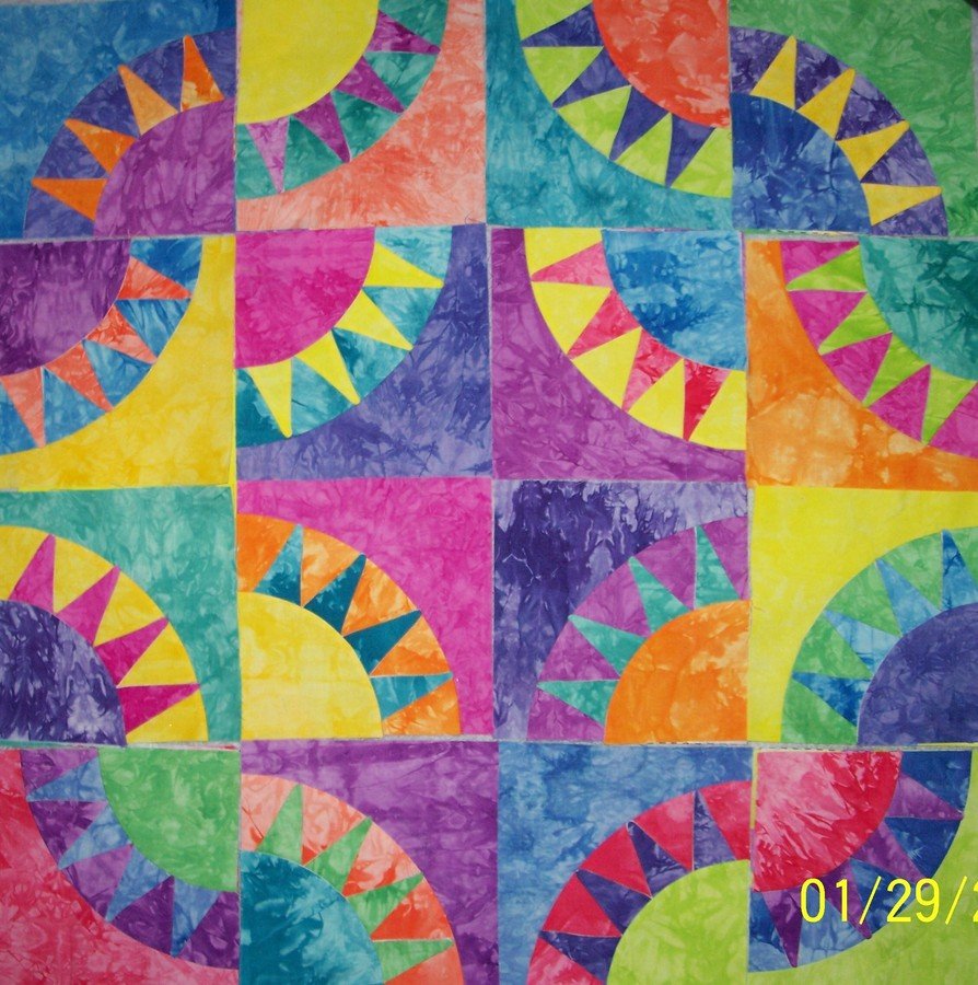 wafermaker Road2CA New York Beauty - My girlfriend and I went to R2CA and bought the foundations for this and then found great fabric. We went back across the street to our hotel room an proceeded to stay up half the night drinking wine, cutting and piecing these blocks. It was the most fun. I found a great batik in my stash when I got home for the backing. I am still quiltng it but it should be done soon.