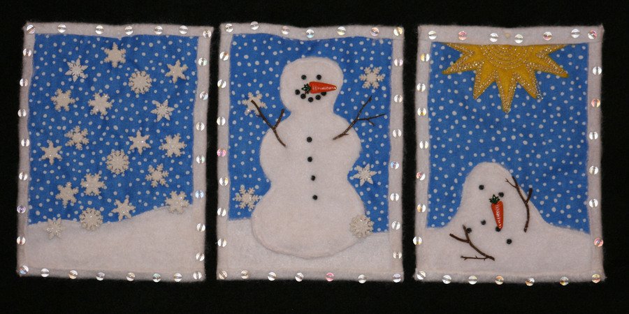 SallyP Snowman-Yesterday,Today,Tomorrow - My entry into 2007 Microcosmos, theme "Yesterday, Today, Tomorrow" at TAQS. Each piece of the triptych is 5"x7".