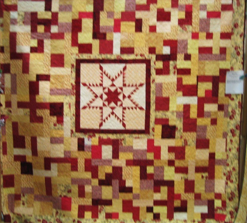 | Design Source - Description | Yellows & Reds highlight the center medallion feathered star. Yellow brick road nicely travels around the medallion. Back is flannel. Machine quilted. Large King aprox 108x120 |