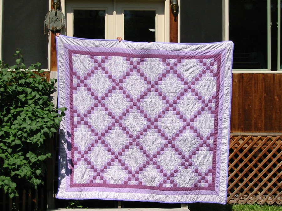 steven1216 Lavender Visions - This is the second quilt I made in 1995. It was also the first time I ever spent more than $3.00 on a yard of fabric. I just had too! I was in a local quilt store in Missoula, Montana and saw this toile fabric and couldn't resist. I machine pieced the quilt together and with the assistance of Alex Anderson and a "Simply Quilts" episode teaching viewers to hand quilt, I hand quilted the entire finished quilt. You cannot visibly see the progression of my stitches, but I can! I started by getting very few stitches per inch, maybe 6 or 7. By the end of the quilting process I was getting anywhere from 10 to 12 per inch. This quilt is currently on my quilt rack and is a favorite for snuggling in the winter with my cats.