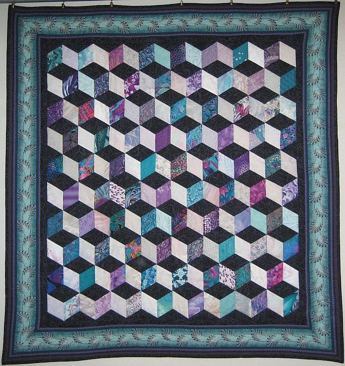 kwlt4fun Tumbling Blocks - This is one of my favorite quilts. The purple and teal diamonds are all different fabrics, the light diamonds are repeated (approx. 10-12 fabrics). It was constructed using Sara Nephew's technique for 60 degree diamonds.