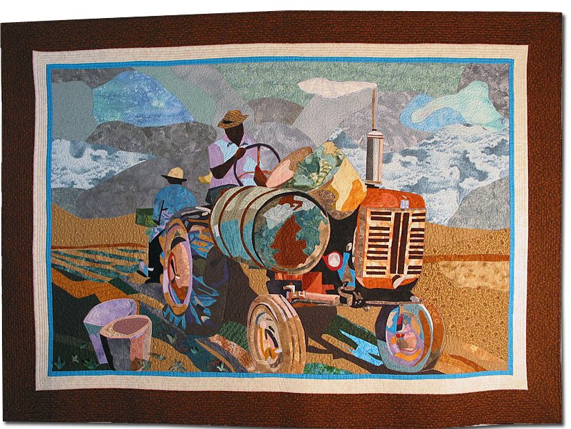 igobroke Planting Time 2 - A famous regional artist by the name of Ivey Hayes contacted me and requested that I recreate some of his paintings into quilted wall hangings. The background of this quilt is pieced. The tractor and people are “puzzle piece” appliqué. It is made of commercial cottons. In this case this was quite a trick to find colors that matched the work exactly as Ivey had painted it.